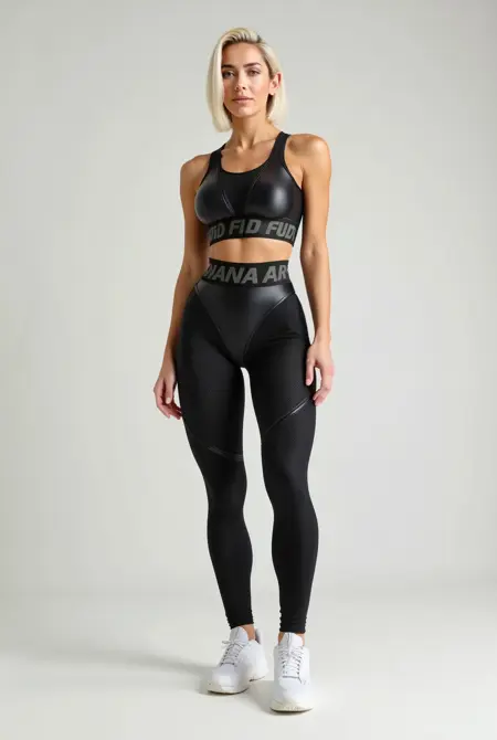 woman wearing fc_blackgymoutfit, black athletic outfit with high-waisted honeycomb textured leggings and matching glossy sports bra, form-fitting compression fabric with contour seams, sleek and stretchy activewear, [scene/lighting/style]
