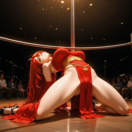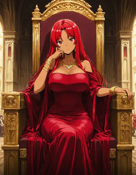 女王姿态(默认服装) AuraKarpa,浅棕色皮肤,长红发,大乳房,红眼睛,动漫风格,中分刘海,红色女王礼服,金色珠宝,项链,手镯,乳沟,王座厅,户外,详细背景,杰作,最佳品质