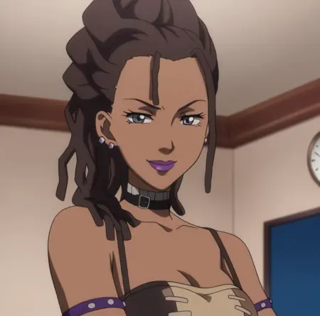 cannon_busters, screencap, brown hair, jewelry, earrings, makeup, lipstick, dark skin, dark-skinned female