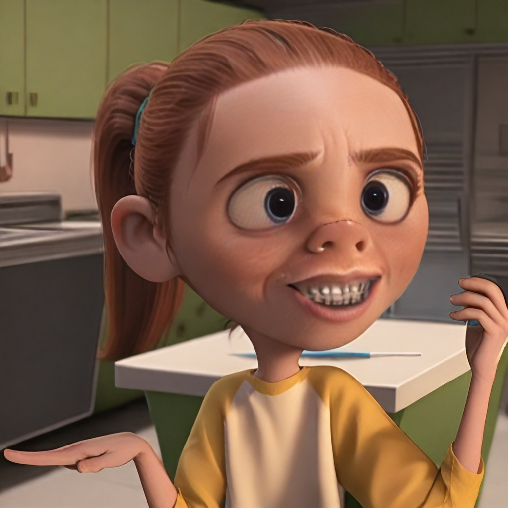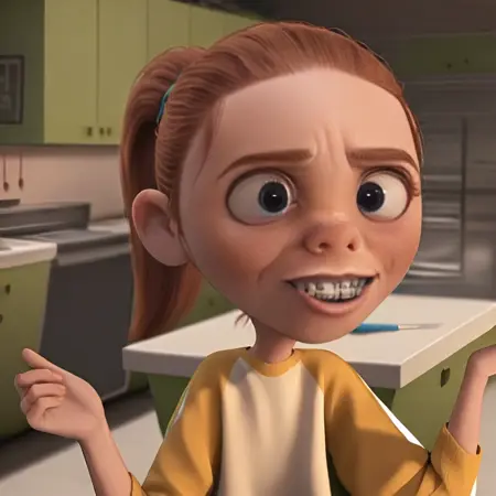 1girl, solo, dark blue eyes, braces, reddish brown hair, extremely concave nose bridge, extremely upturned nose, wide nose visible nostrils, preteen, ponytail, 2tone shirt, round face