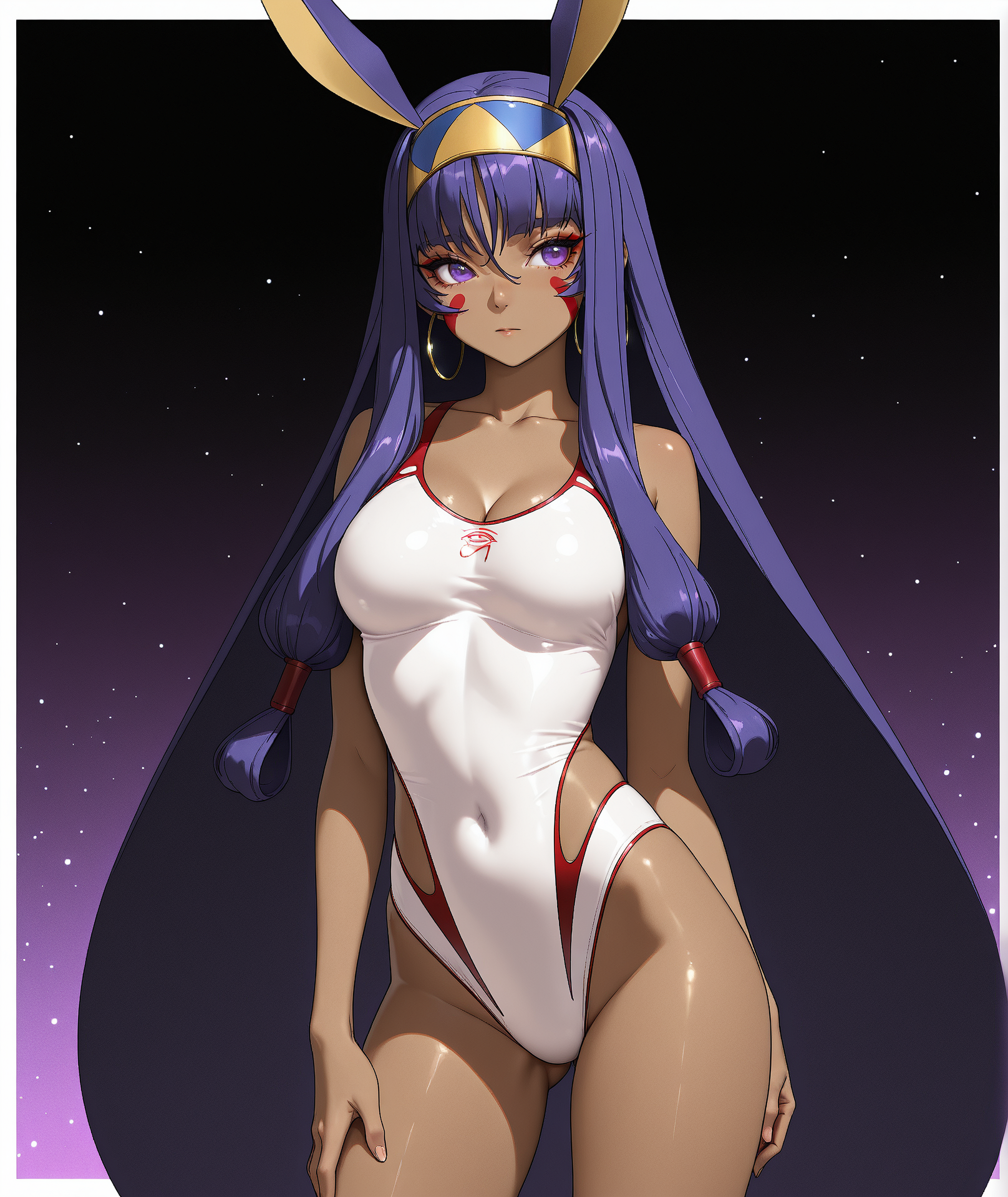 - 속눈썹, 코, 긴 머리, 동물 귀, 눈 사이 머리카락, 매우 긴 머리, 보라색 눈, 보라색 머리, 옆머리, 귀걸이, 헤어밴드, 검은 피부, 검은 피부를 가진 여자, 얼굴 무늬, 머리관, 낮게 묶은 긴 머리, 고리 귀걸이, 페이스페인트, 야누스 귀,