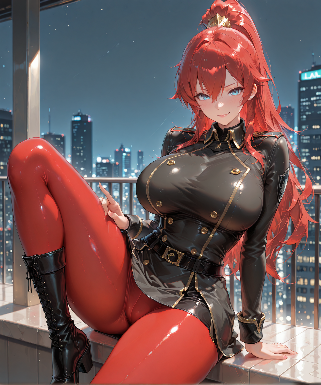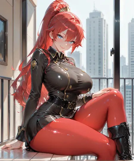 - 彼女のオリジナルドレス:軍服、金色の髪飾り、赤いパンツストッキング、ブーツ、ミニスカート