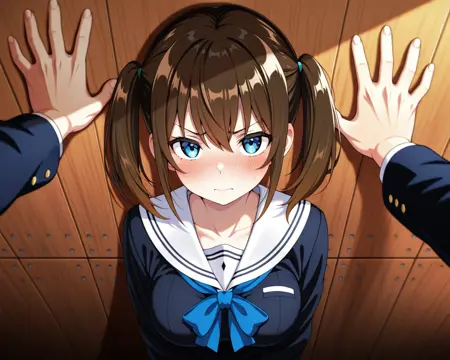 0.3–: Looks like a standard wall-pinning (kabedon) pose