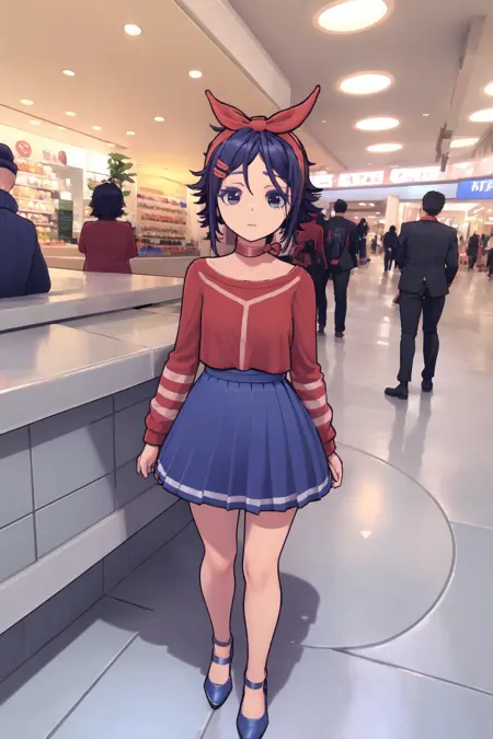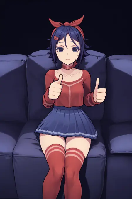 파란 넥타이, 흰 셔츠, 빨간 카디건, 파란 주름치마, 검은 스타킹, 빨간 슬리퍼 — 미라 세트