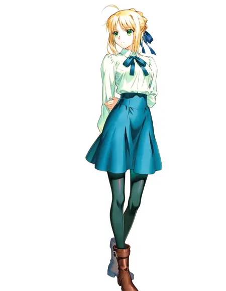 outfit 1- blue skirt, shirt, hair ribbon, French braid, leather boots, black pantyhose,