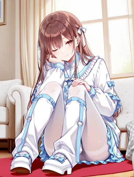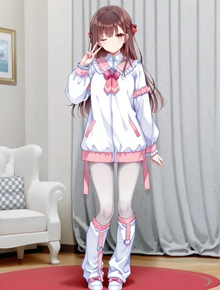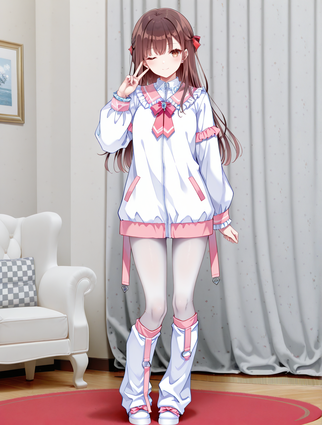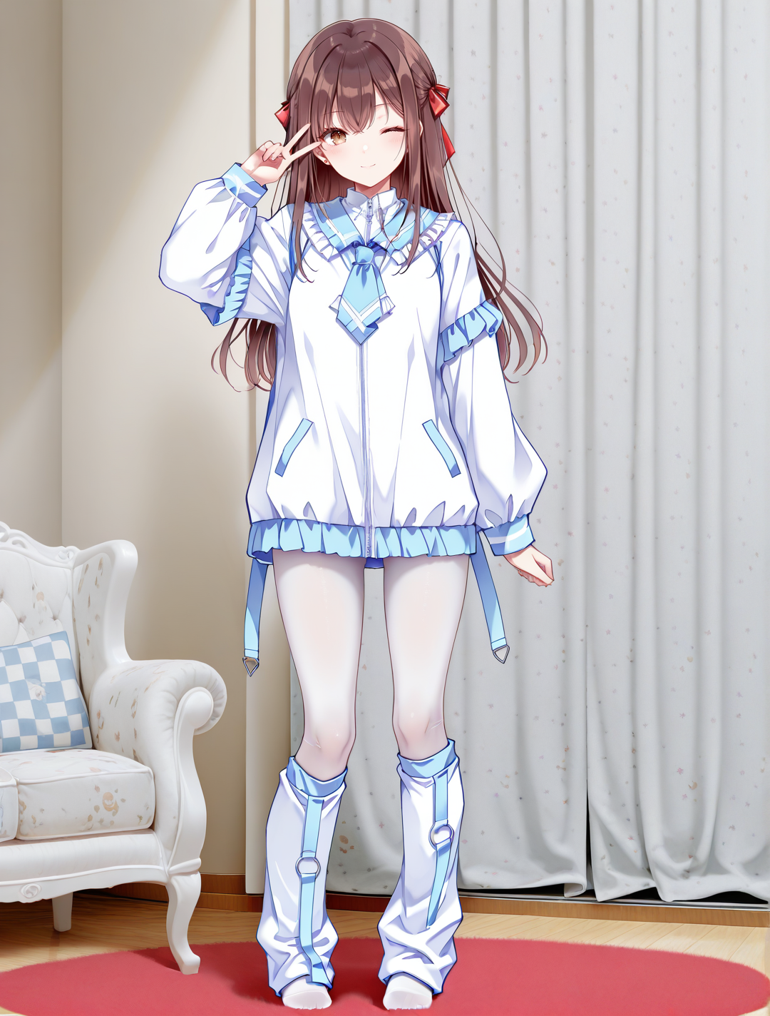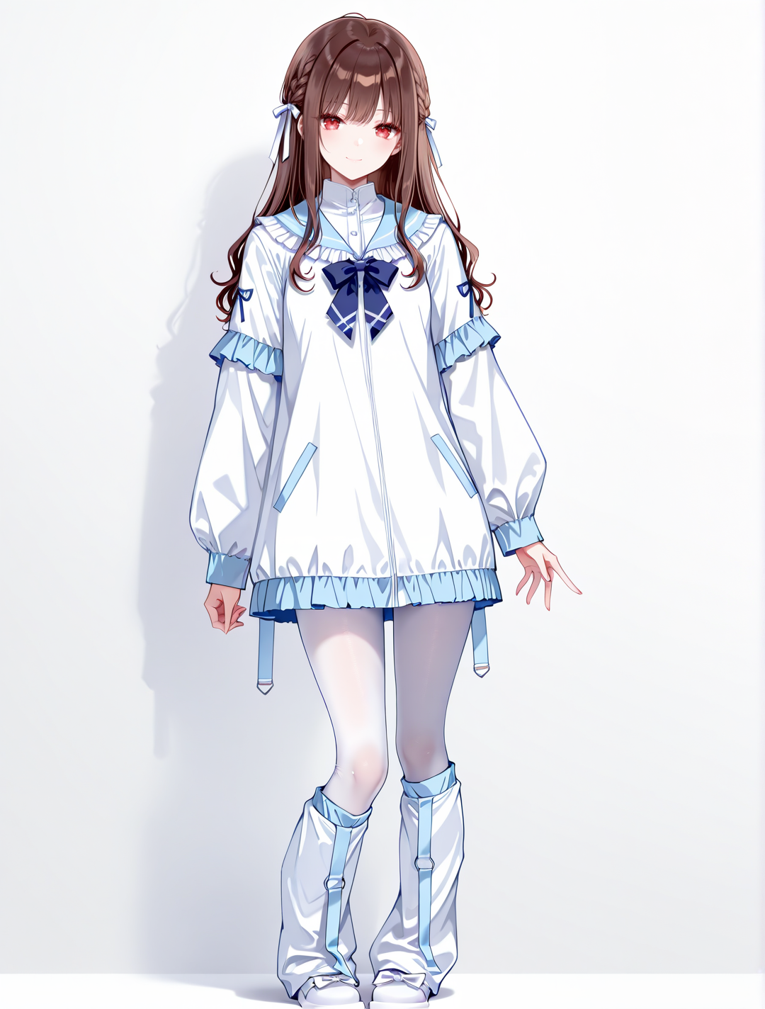 white jacket,zipper,leg warmers,frills,frilled sailor collar,white pantyhose,white footwear,