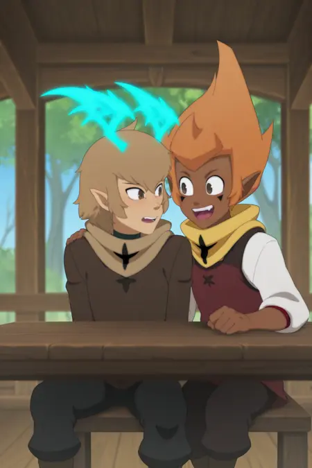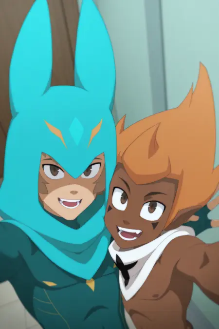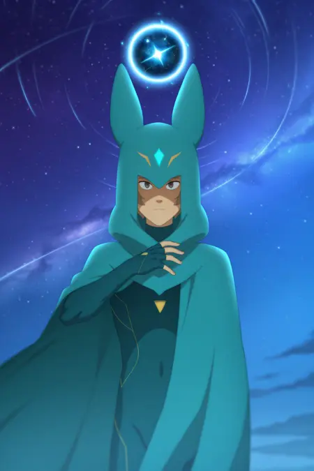 green bodysuit, green cape, head wings or animal hood, fingerless gloves