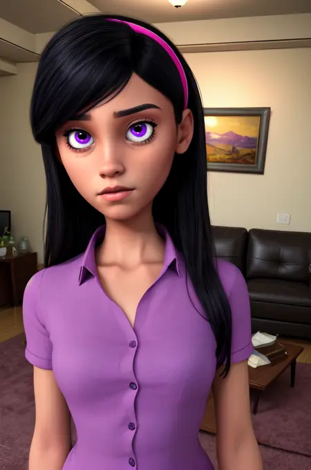 Purple hairband, pink or purple shirt/sweater - mini skirt, or pants,