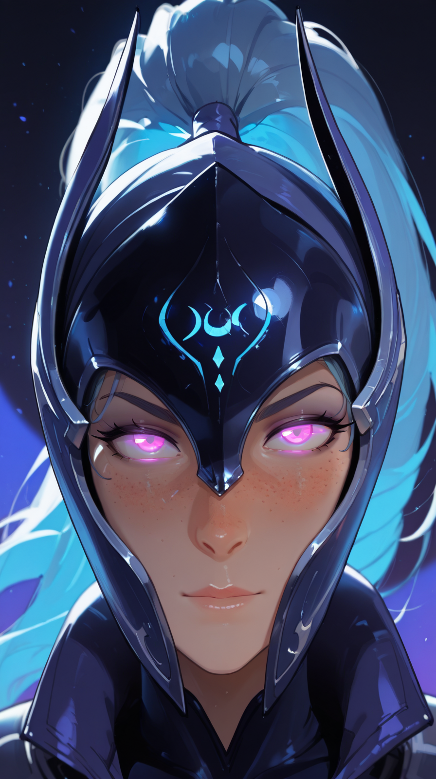 luna,blue hair, long hair, ponytail,purple eyes, ,freckles,helmet, bodysuit,