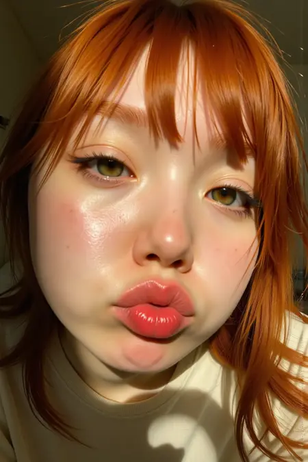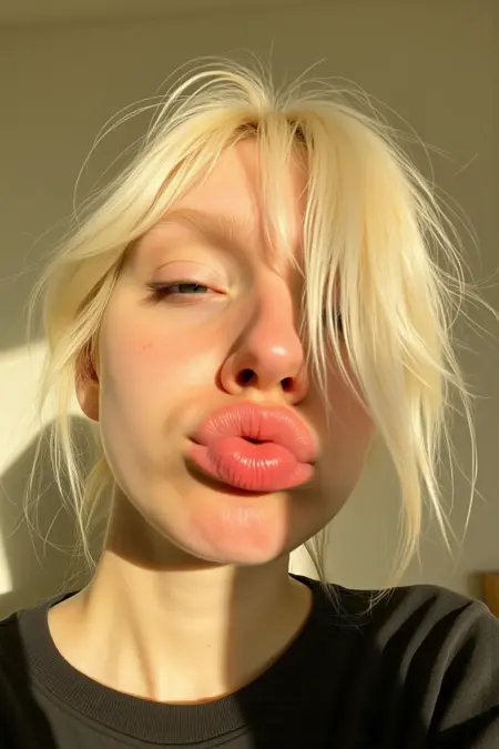k1ssm3pl34s3, (角度糟糕的自拍:1.2) 的可爱女孩,有 (无心鸭嘴脸:1.3),乱发垂落在脸上,光线不均,轻微模糊,简约卧室背景,(嘟嘴可爱嘴唇:1.4)