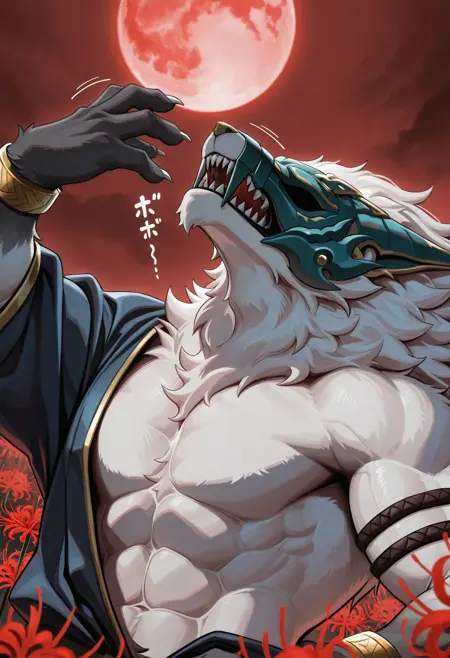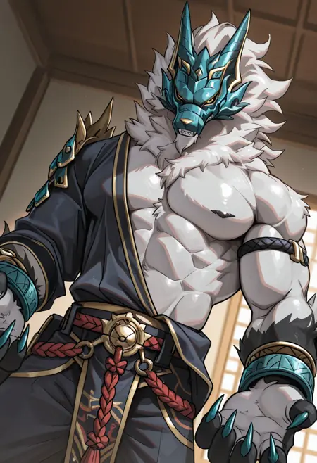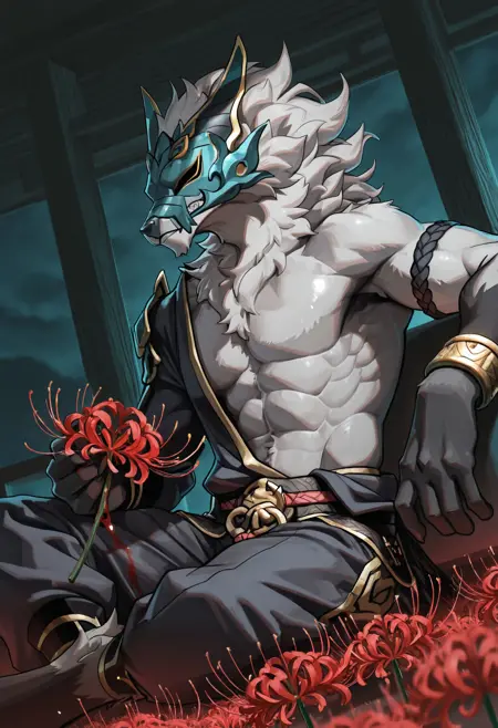 Illustrious: best quality, amazing quality, very aesthetic, absurdres, newest, hoolay_hsr, furry male, solo, furry, abs, muscular, hadanugi dousa, golden bracelet, no eyes, ...your tags...