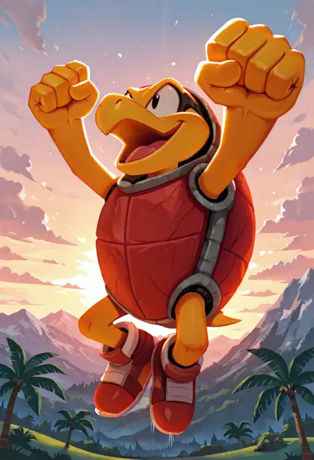 Boomer the Turtle, bald, yellow skin, yellow turtle beak, black eyes, red shell, red shoes