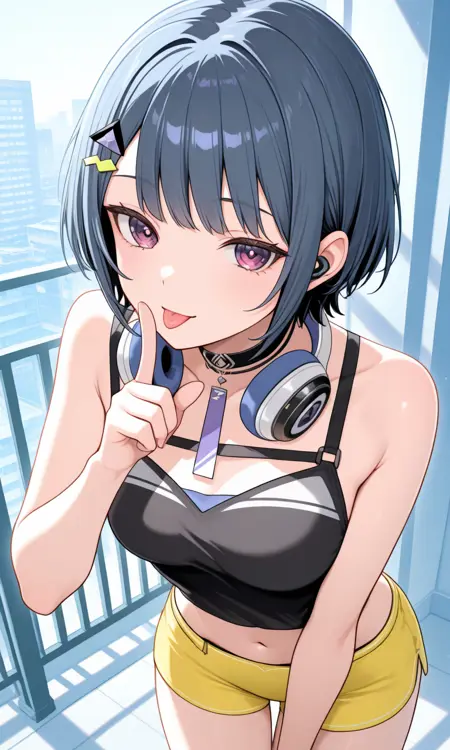 koshimizu toru, toru default, short hair, triangle hair ornament, black choker, black tank top, midriff, navel, yellow shorts, short shorts💤第二套服装: