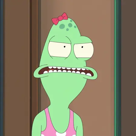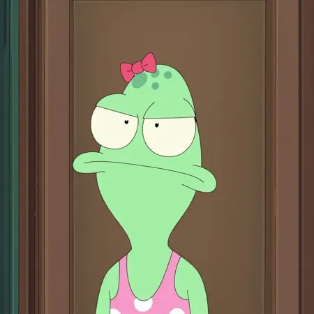 Jessie, 1girl, lime green alien, pink bow on head, pink polka dot sleeveless dress, white shoes,