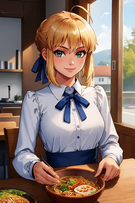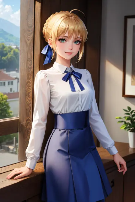 Casual Outfit: sabercasual, ahoge, braid, hair bun, hair ribbon, white shirt, neck ribbon, long sleeves, blue skirt, pantyhose