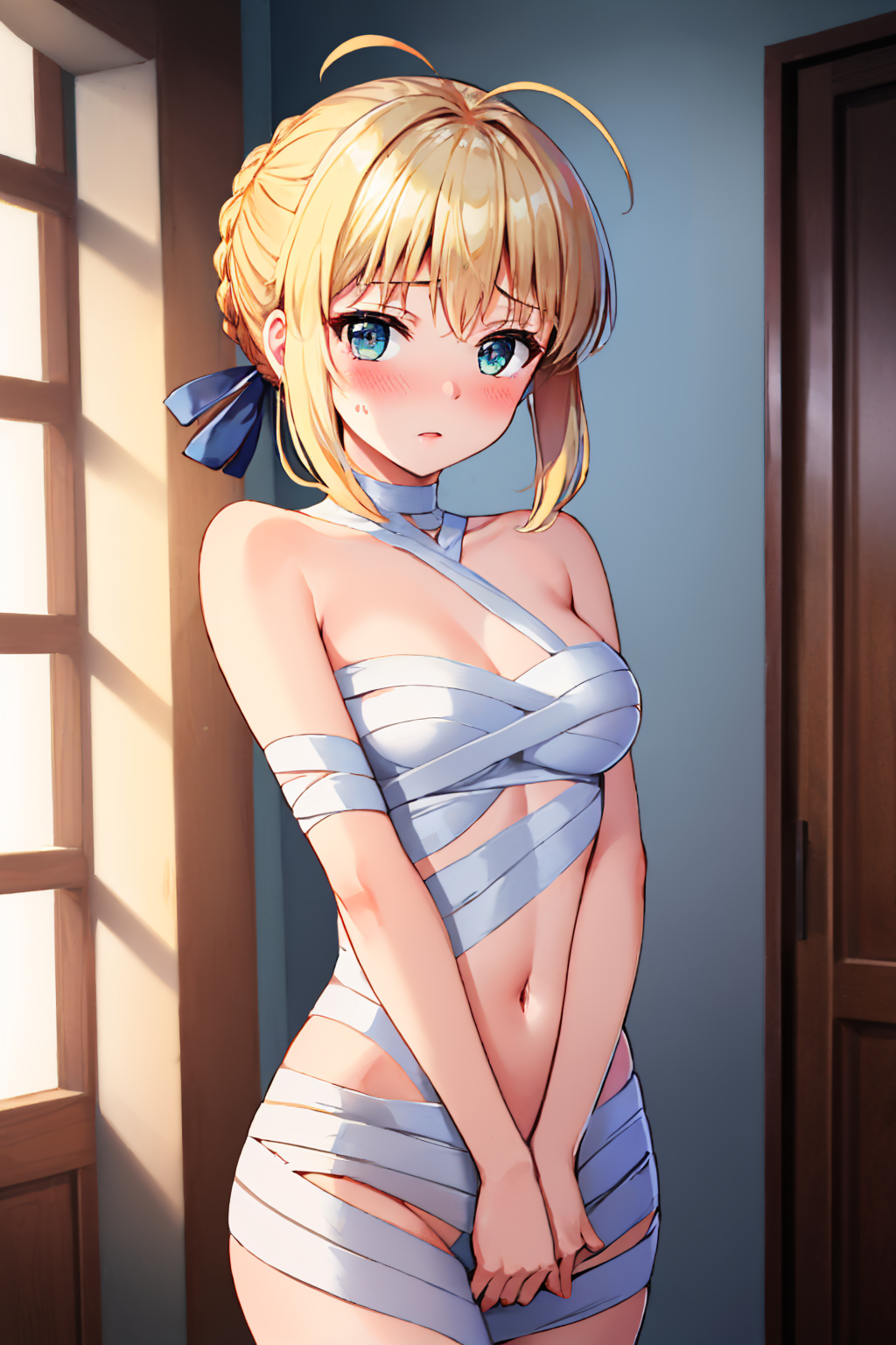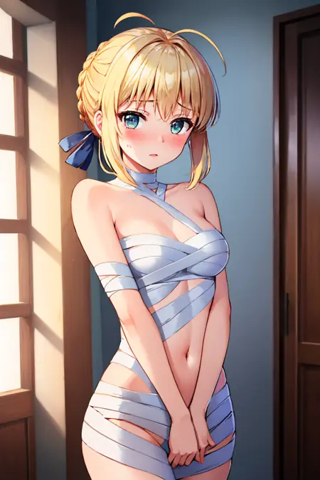Servant: saberdef, ahoge, braid, hair ribbon, armored dress, ribbon, gauntlets