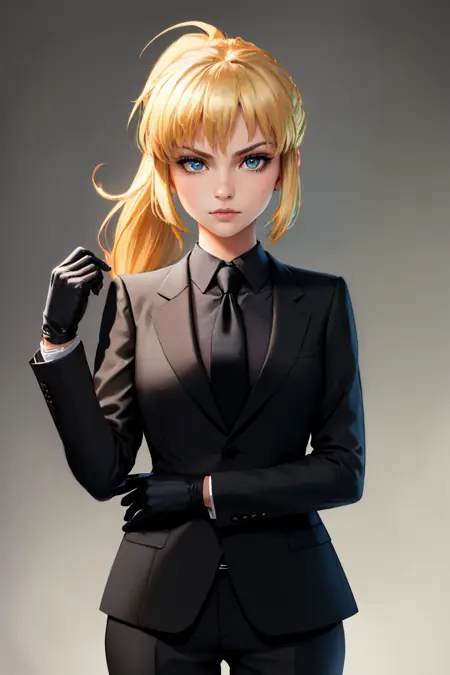 Fate/Zero: saberzero, ahoge, ponytail, formal, suit, black shirt, necktie, black gloves, pants