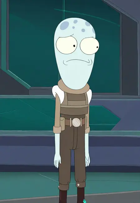 Yumyulack, 1boy, light blue alien, light blue skin, brown jacket, brown pants, brown belt, dark brown boots with green gem,