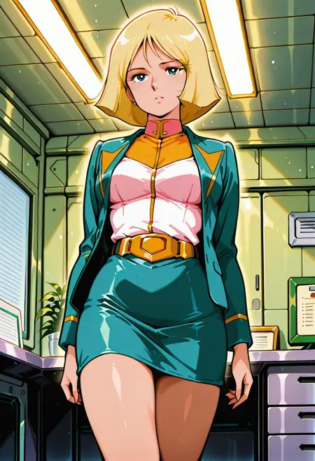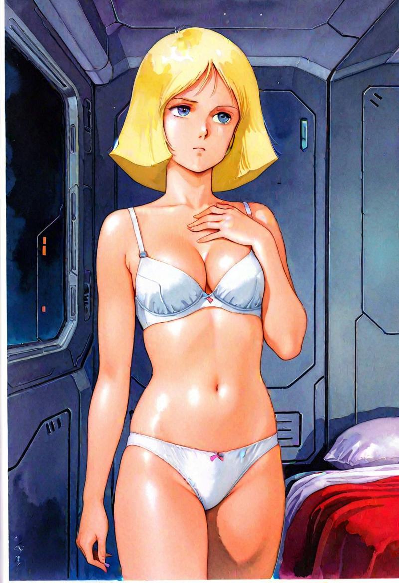 フェイス:1girl, sayla mass, 短髪、青い目、金髪、中程度の胸、