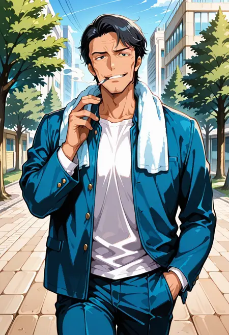 itou_kisaku,1boy,solo,老男、黒髪、短髪、黒目、ヒゲ、ターン肌、醜い顔の男性、男性焦点、首にタオル、青ジャケット、白シャツ、