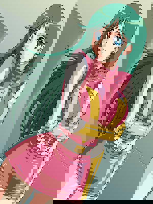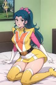 パイロットスーツ:黄色と白の制服で、胸元にオレンジのV字模様、ピンクのタイトな袖、黄色と白のミニスカート、白の手袋、ボルテス・ベルト、黄色の太ももブーツ、