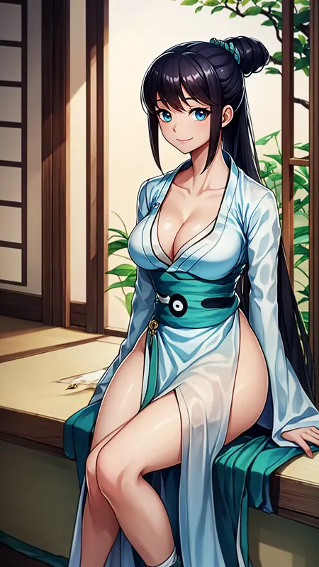 yun mi, 1girl, socks, breasts, solo, weapon, sword, cleavage, black hair, long hair, hair ribbon, large breasts, full body, chinese clothes, smile, looking at viewer, blue eyes, wide sleeves, half updo, hanfu shoes, sash, yin yang obi, side slit, arms at sides,