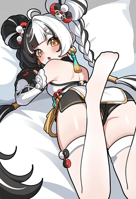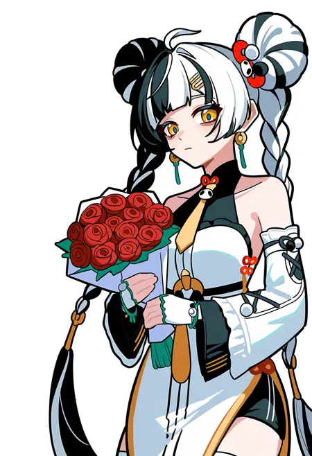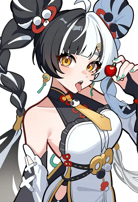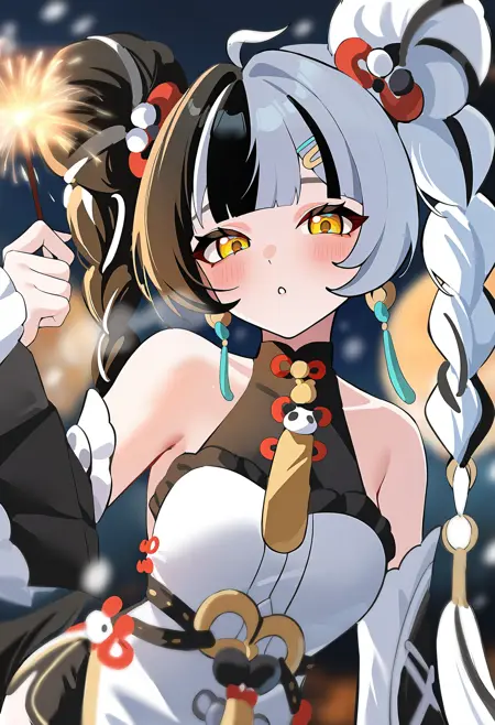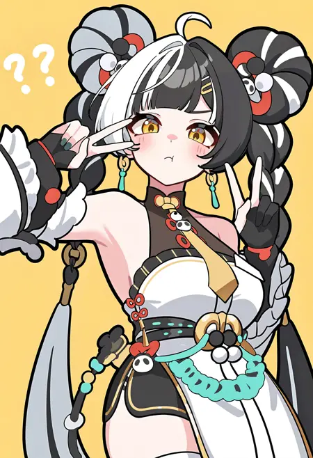 トリガーワード:liuyin,1girl,solo,multicolored hair,black hair,yellow eyes,white hair,long hair,dress,two-tone hair,braid,hair ornament,bare shoulders,twin braids,detached sleeves,double bun,jewelry,earrings,chinese clothes,white dress,hair bun,split-color hair,very long hair,sleeveless,white sleeves,yin yang,twintails,tassel,ahoge,hairclip,grey hair,long sleeves,china dress,blunt bangs,gloves,black shorts,thighhighs,shoes,black footwear,streaked hair,white thighhighs,