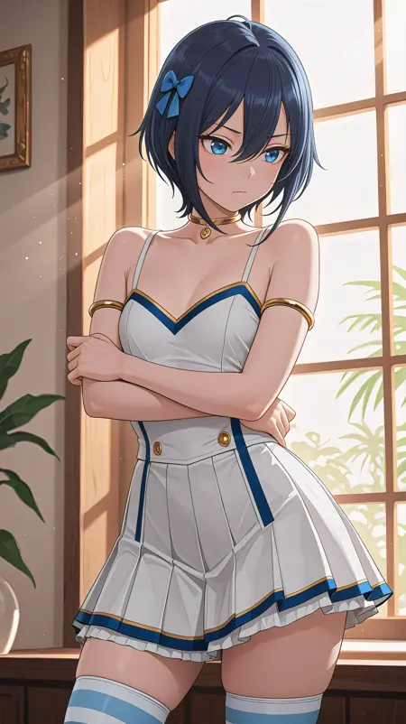 shion_nikaido, dark blue hair, hair between eyes, medium hair, blue eyes, black hat, military hat, black cloak, black dress, white frills, layered frills, white gloves,