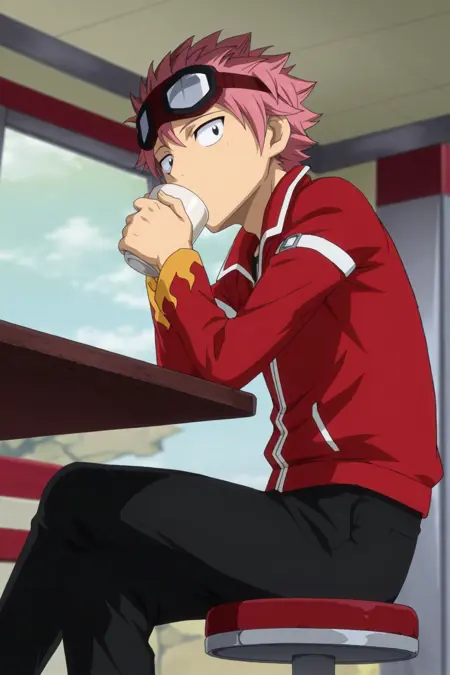 頭にゴーグル、赤いジャケット、黒いズボン