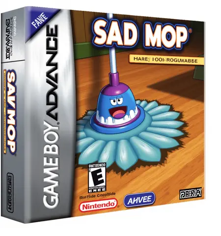 gbaboxを角度から見たもの、英語のテキスト、ボックスアート、著作権名、壊れたスマートフォンで溢れかえる単独のアルミニウム製の円筒形のゴミ箱、上部のテキストは赤い文字で「TRASH」と表示