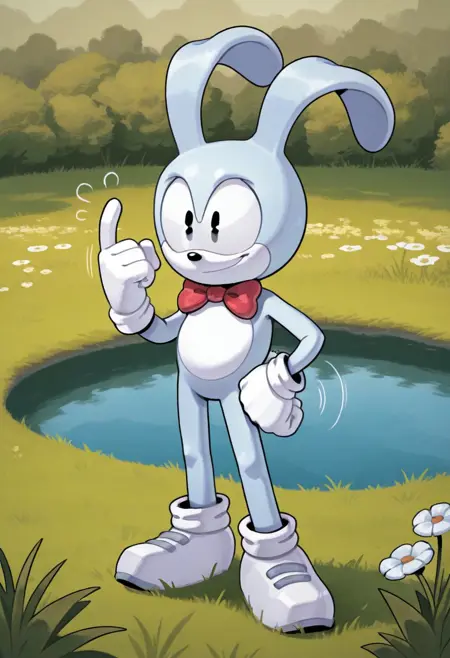 Feels the Rabbit, light blue skin, black eyes, white muzzle, floppy rabbit ears, red bow tie, white gloves, white shoes