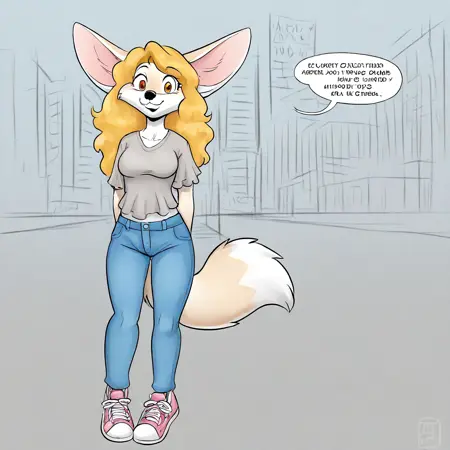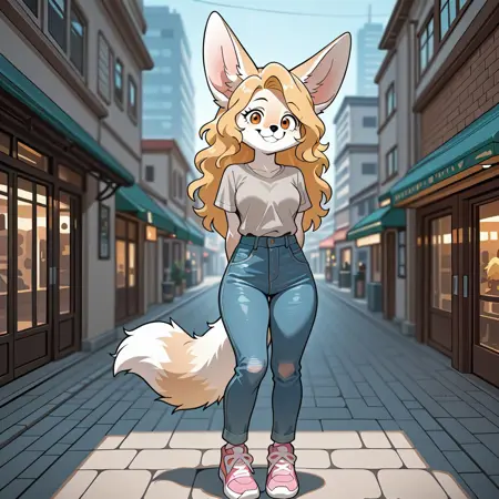 fox, fox girl, fennec fox, tan and white fur, blonde hair, long hair, amber eyes, black nose, large fox ears, fox tail, medium breasts,