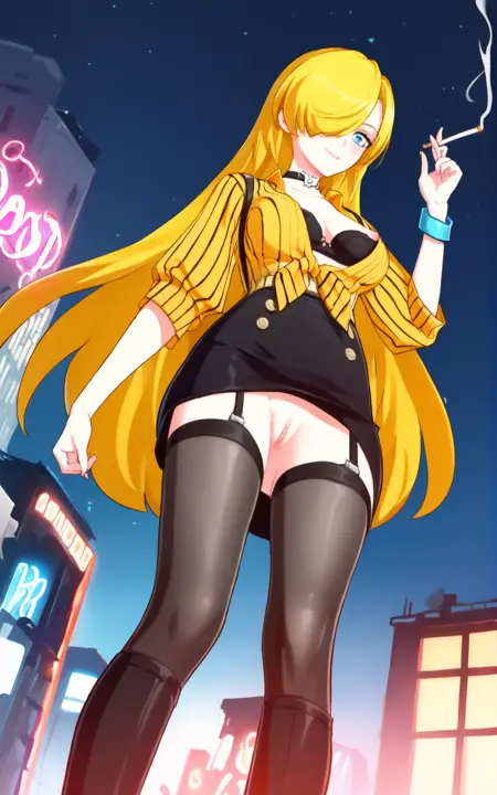 衣装: 黒い靴、ブーツ、膝上ブーツ、太ももハイブーツ、黒い太ももハイブーツ、ガーター straps、スカート、黒いスカート、ペンシルスカート、ミニスカート、下着、ブラ、黒いブラ、シャツ、縞シャツ、縦縞シャツ、黄色いシャツ、縞模様の服、縦縞の服、チョーカー、黒いチョーカー、カラー、ジュエリー、ブレスレット