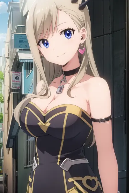 머리 장신구, 드레스, 가슴 노출, 어깨 노출, 보석, 하트, 귀걸이, 초컬러, 검은 드레스, 스트랩리스, 스트랩리스 드레스, 팔찌, 어깨 가방, 하트 귀걸이, 하트 초컬러,