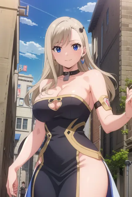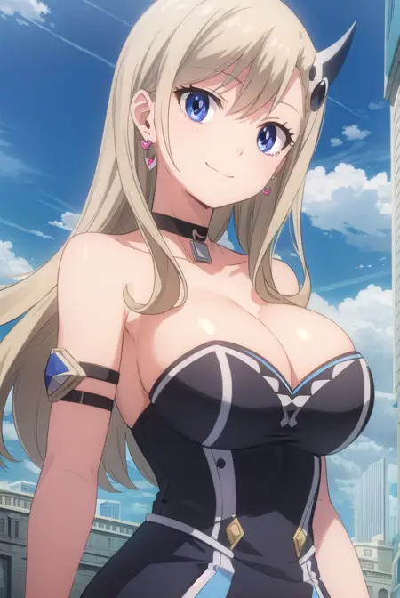 머리 장신구, 헤어클립, 치마, 가슴 노출, 보석, 귀걸이, 부츠, 분리된 소매, 미니스커트, 목걸이, 연필 치마, 흰 셔츠, 빗장뼈, 어깨 노출, 파란색 칼라, 소매 없음,