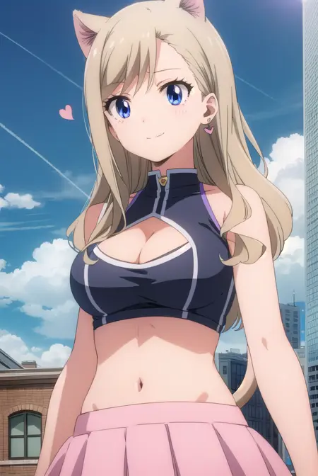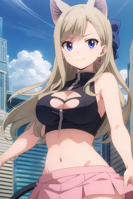 치마, 리본, 배꼽, 동물 귀, 가슴 노출, 보석, 꼬리, 하트, 주름 치마, 귀걸이, 복부, 고양이 귀, 미니스커트, 크롭탑, 고양이 꼬리, 옷 자르기, 가슴 노출 자르기, 분홍 리본, 분홍 치마, 꼬리 장식, 하트 귀걸이, 하트 자르기, 꼬리 리본,