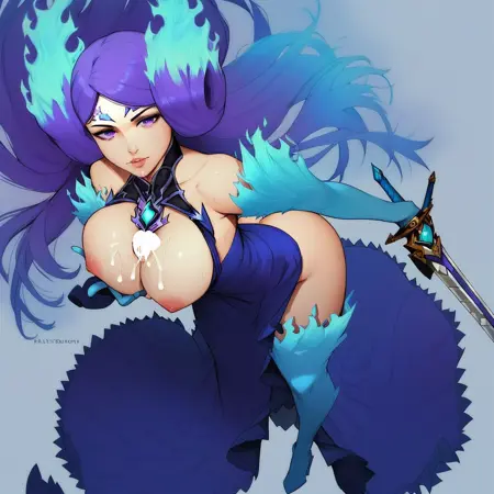 (Xenoblade_Brighid, 長い髪, 紫の髪, 炎のような髪, 紫の目, 青い炎, ドレス, 胸元, 肩出し, 肘まで手袋, 太ももブーツ, 剣)