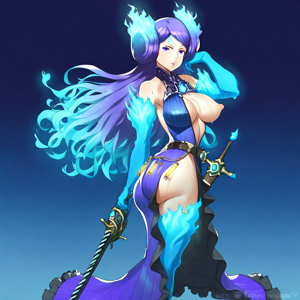 (Xenoblade_Brighid, long hair, purple hair, fiery hair, purple eyes, blue fire, dress, cleavage, bare shoulders, elbow gloves, thigh boots, sword),