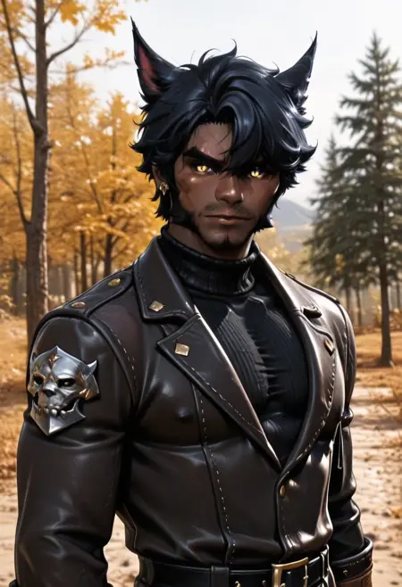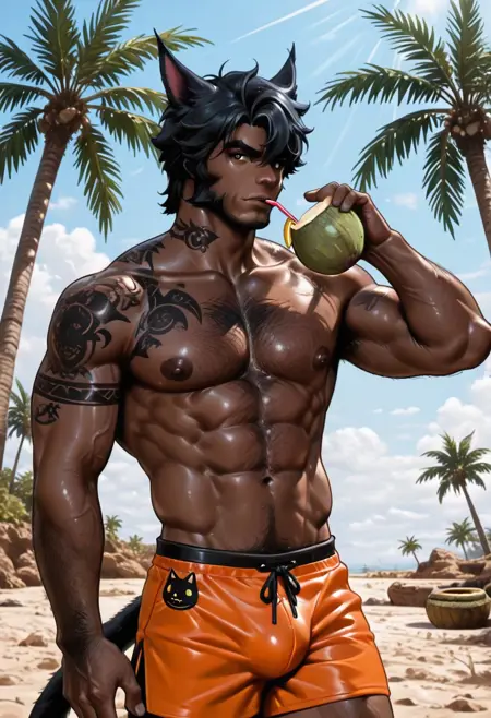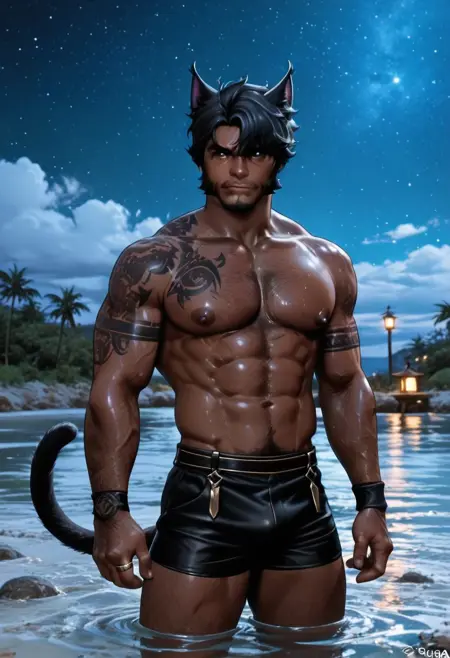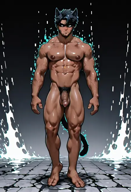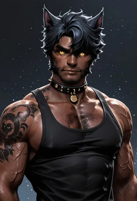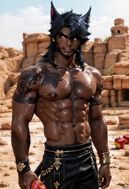 로이라, 남성, 혼자, 남성 중심, 검은 피부, 검은 피부를 가진 남성, 검은 머리, 단발, 황금색 눈, 근육질, 근육질 남성, 근육질, 바라, 복근, 가슴근육, 큰 가슴근육, 털난 가슴, 양측 수염, 큰 유두, 유두, 배꼽, 뾰족한 귀, 인간의 귀 없음, 늑대 귀, 고양이 꼬리, 동물 귀,