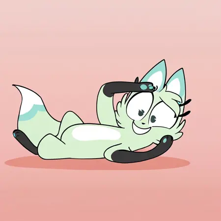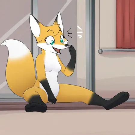 (fauvfoxart),clean digital illustration, smooth cartoon style, flat shading with soft gradients, expressive character design, large shiny eyes, exaggerated facial expressions, pastel and light color palette, minimal background with simple furniture and curtains, cel-shading inspired but with soft blending, high contrast outlines, semi-anime influence, consistent lighting