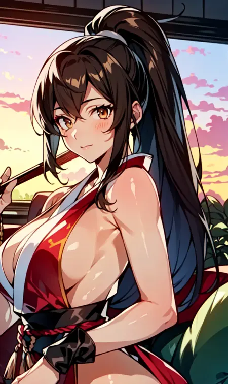 Mai Shiranui, 1girl, solo, shiranui mai, breasts, brown hair, hand fan, ponytail, pelvic curtain, long hair, folding fan, brown eyes, cleavage, japanese clothes, revealing clothes, large breasts, rope, open mouth, sideboob