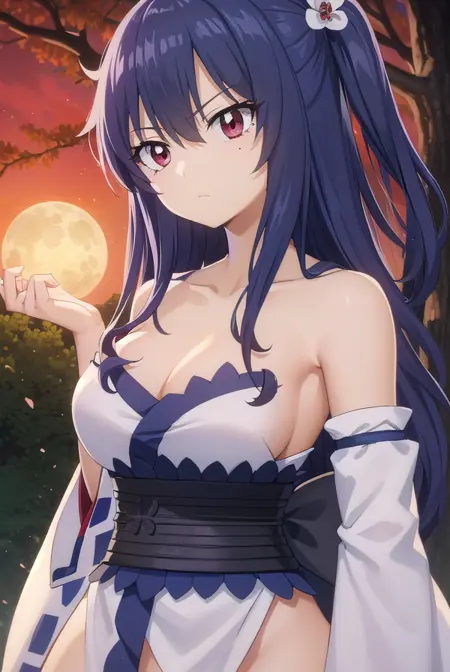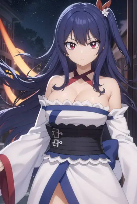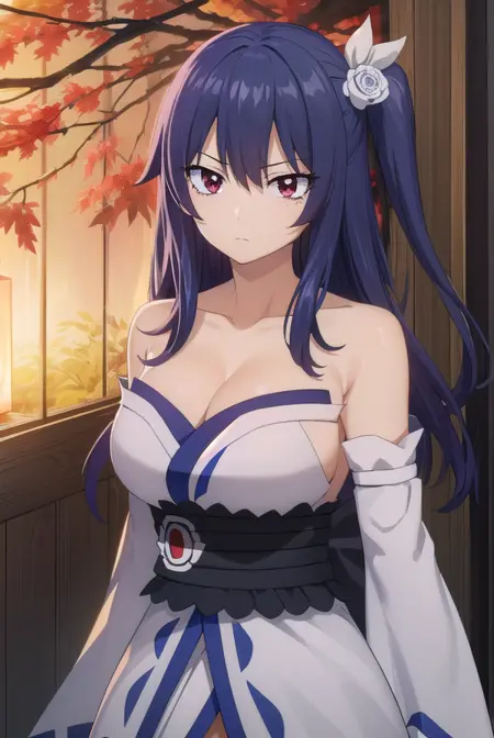 花朵,发饰花朵,一侧高耸,锁骨,露肩,可拆卸袖子,(胸脯:1.2),和服,(白色和服:1.5),腰带,腰带,过膝袜,黑色过膝袜,(蓝色镶边:1.5),(无肩带:1.5),