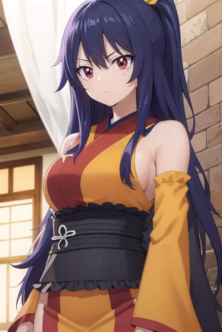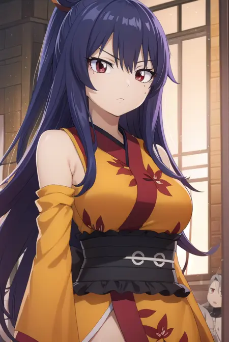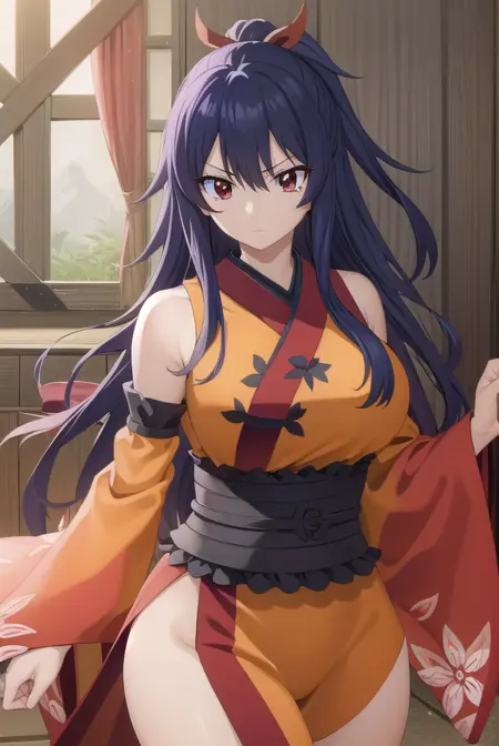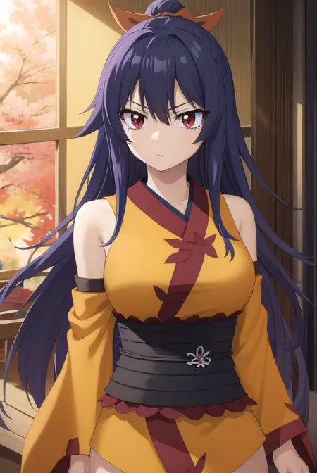 蝴蝶结,发带蝴蝶结,马尾,橙色蝴蝶结,过膝袜,可拆卸袖子,和服,黑色过膝袜,和服,腰带,腰带,凉鞋,树叶图案,黄色和服,