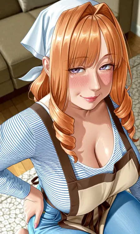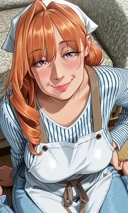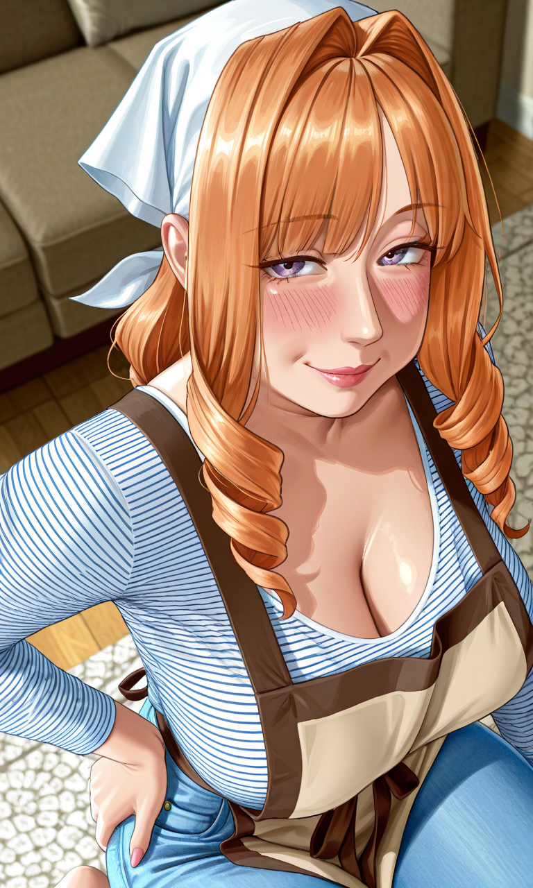 white bandana, long apron, stripped shirt, long sleeves, denim pants,