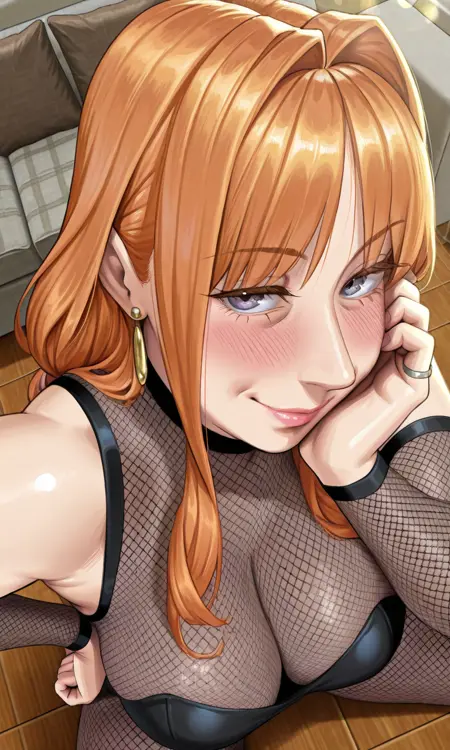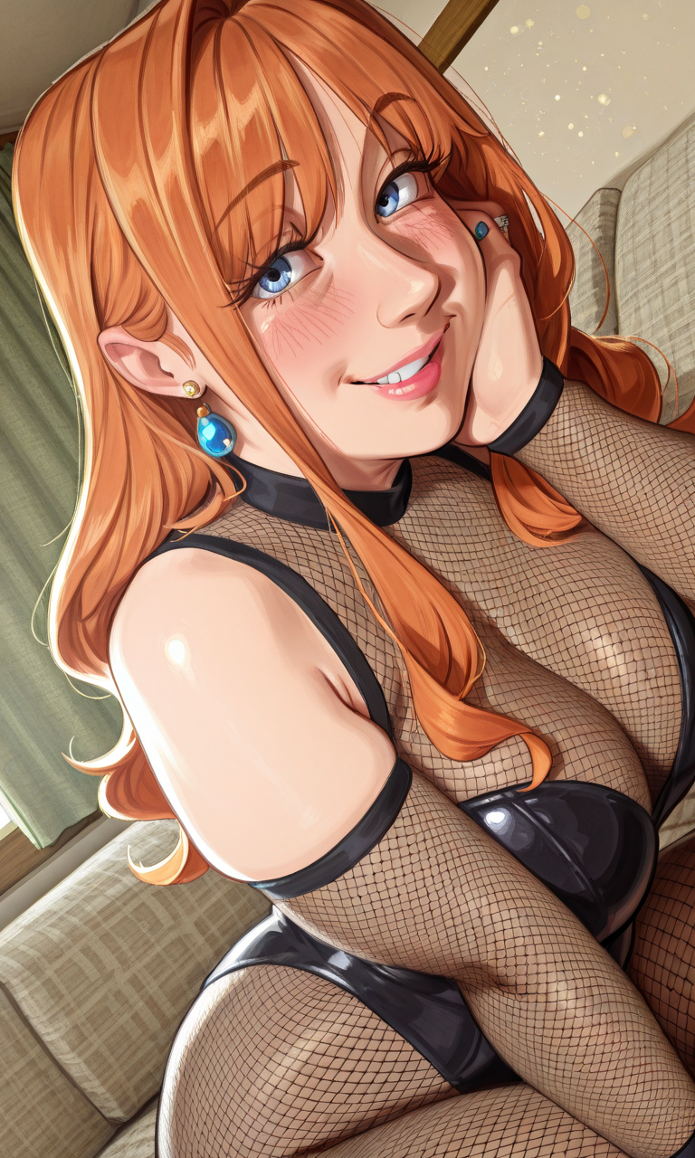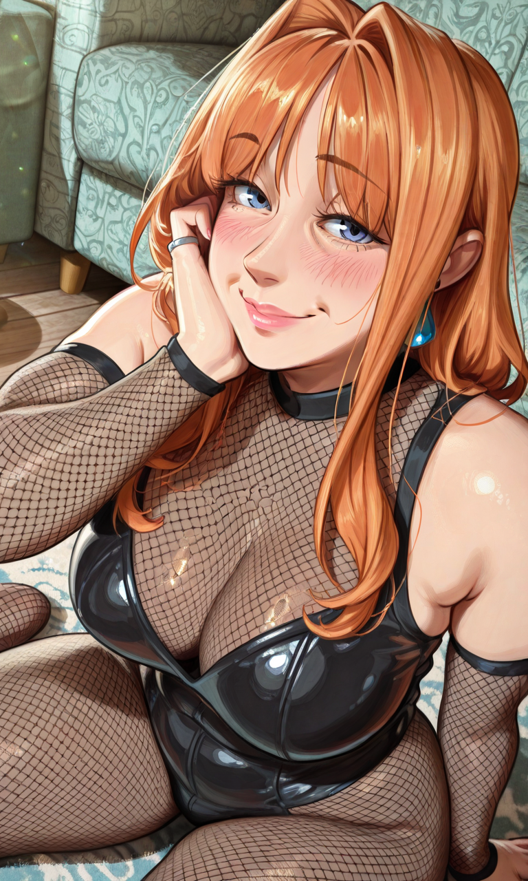 fishnets, ring, earrings, fishnet bodysuit, bodystocking, bare shoulders, see-through, detached sleeves, see-through cleavage, bodysuit,