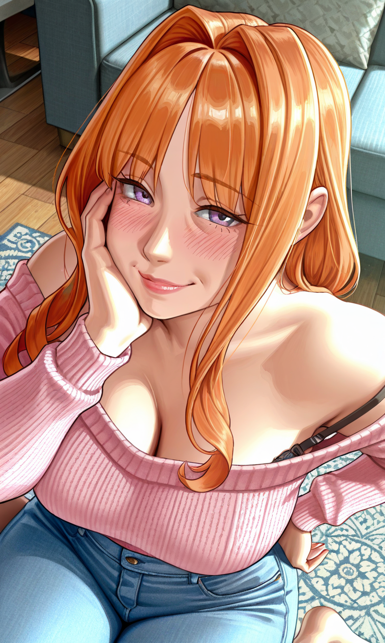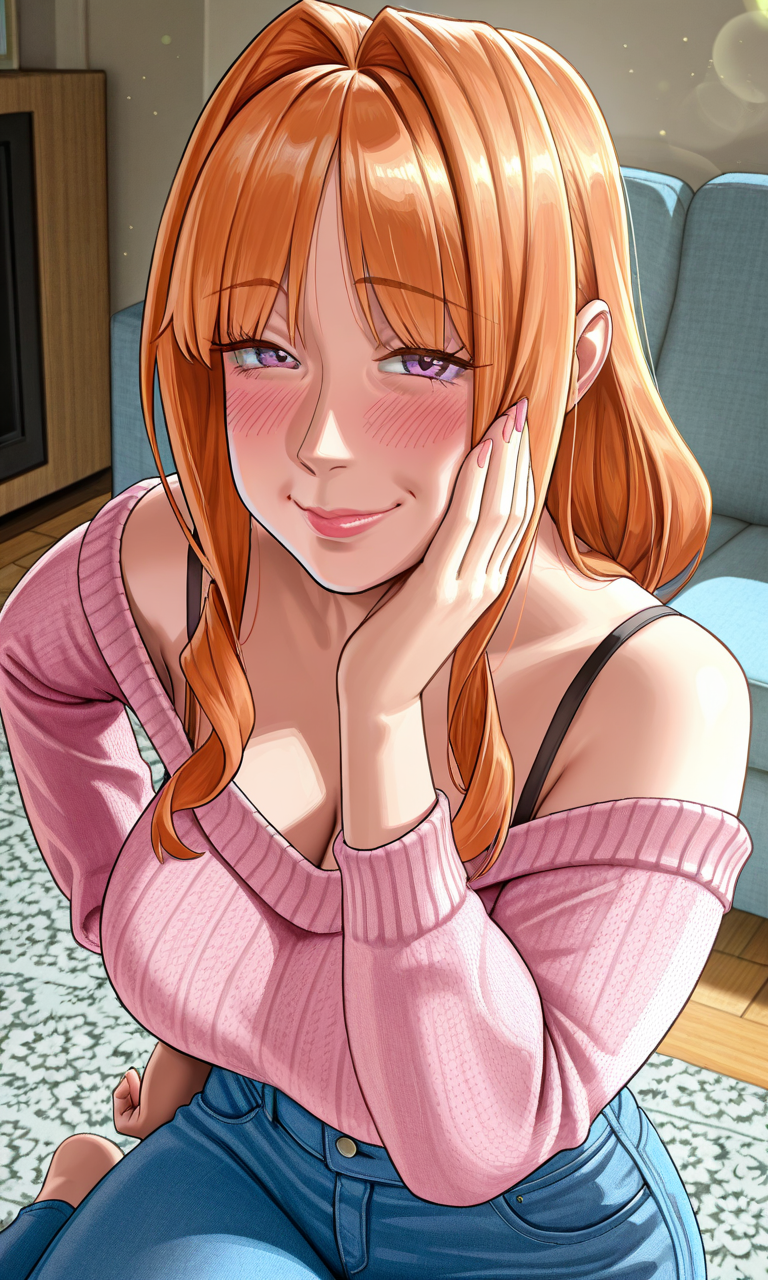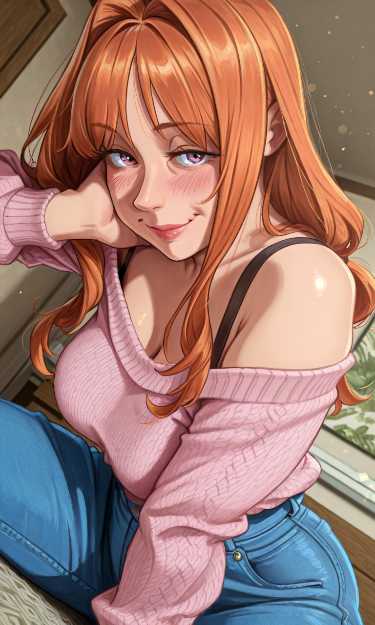pink sweater, high-waist pants, denim, long sleeves, sweater tucked in, blue pants, off-shoulder sweater, strap slip, off shoulder, bra strap,