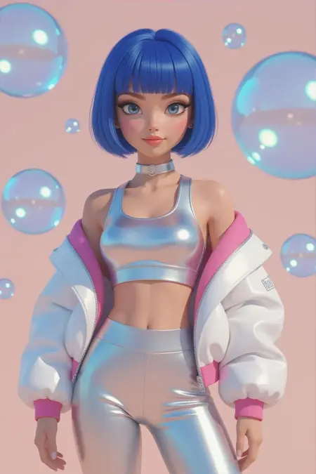 char1, marcela, 1girl, solo, blue hair, blue eyes, breasts, pants, looking at viewer, short hair, navel, jacket, bangs, sports bra, choker, off shoulder, blunt bangs, midriff, smile, tight pants, torn clothes, cowboy shot, crop top, open jacket, lips, simple background, bob cut, bubble, nail polish, white jacket, yoga pants, open clothes