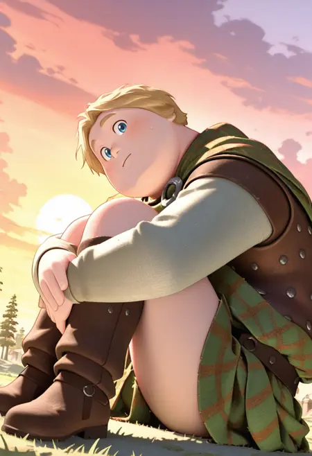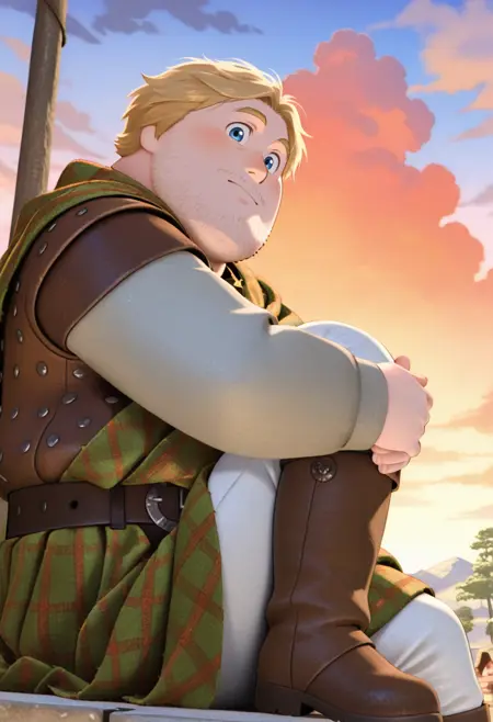- 古希腊服饰, 绿色格子长袍, 棕色盔甲, 灰色毛衣, 腰带, 棕色宽松袜子, 棕色靴子
