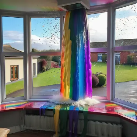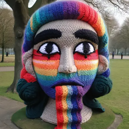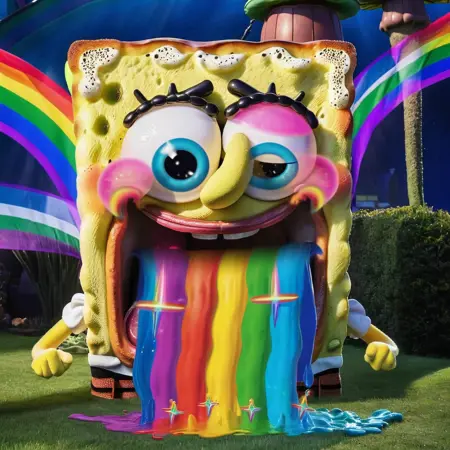 Trained on rainbow barf cartoons, memes, snappy filter pics.