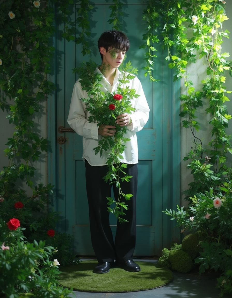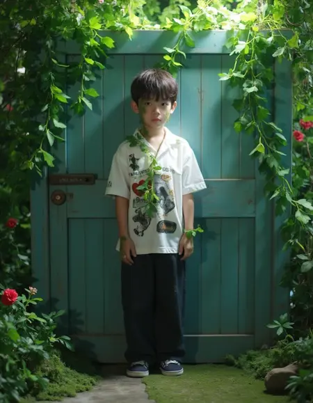 ▸ masterpiece,best quality,highres,mottled light,a little asian boy,plant,water,Dark blue Butterfly Bush,Free camera,Golden Ratio,Crouching on the ground,Polo Shirt,reflection,